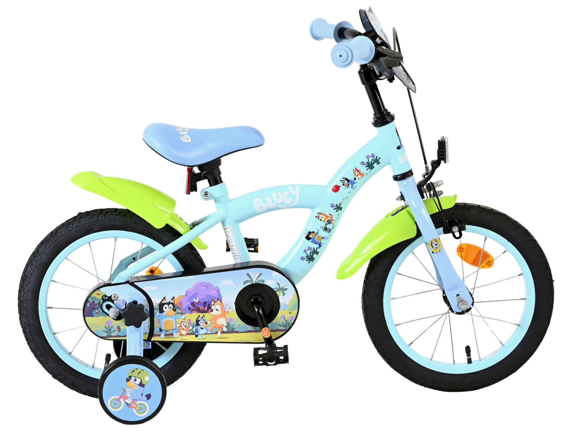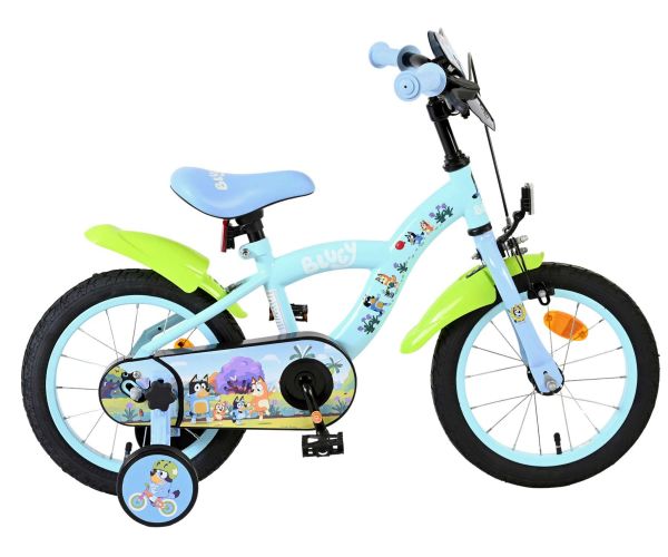 Voor kleine avonturiers is er de 14 inch Bluey kinderfiets van Volare – dé ideale fiets voor kinderen die klaar zijn om zelfverzekerd de wereld te verkennen. De vrolijke lichtblauwe kleur in combinatie met de opvallende neon groene spatborden geeft deze fiets een speelse en frisse uitstraling, perfect passend bij de energieke stijl van Bluey.