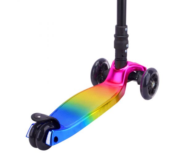 Dankzij het slimme lean-to-steer systeem leren kinderen spelenderwijs hun evenwicht te bewaren, terwijl de drie wielen zorgen voor extra stabiliteit en vertrouwen onderweg. De dubbele achterwielen zijn voorzien van heldere knipperlichten, waardoor je kind altijd goed zichtbaar is. Voor extra veiligheid beschikt de step over een stevige stomprem, waarmee afremmen eenvoudig en betrouwbaar gaat.