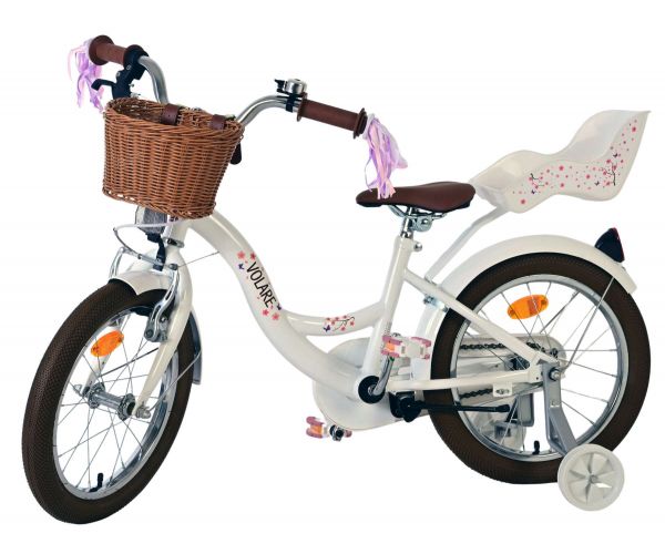 Veiligheid staat voorop! Daarom heeft deze gave fiets een handrem en een terugtraprem, afneembare zijwieltjes en een gesloten kettingkast. Ook aan het comfort is gedacht. De mooie witte Volare fiets heeft een comfortabel zacht zadel, een poppenzitje, vrolijke handvatversieringen en een handig rieten mandje. Om zo lang mogelijk van de fiets te kunnen genieten zijn het zadel en stuur in hoogte verstelbaar. Wordt geleverd inclusief al het montagemateriaal dat nodig is om de fiets in elkaar te zetten!