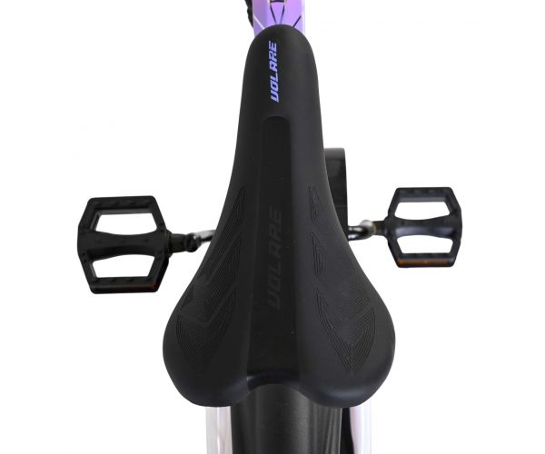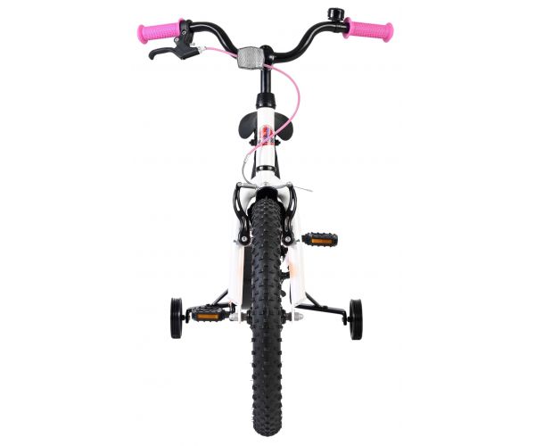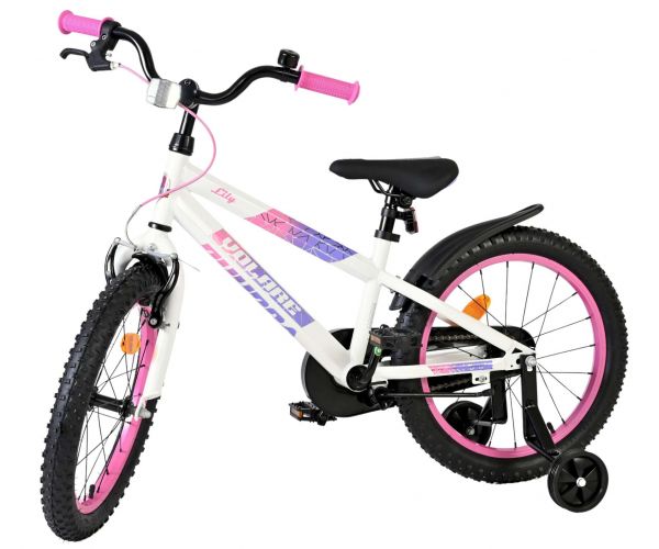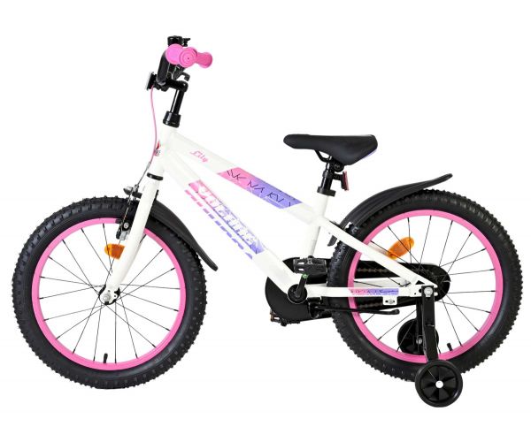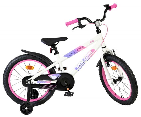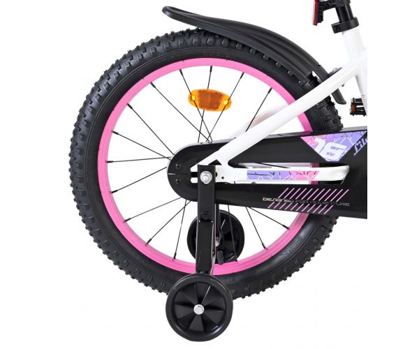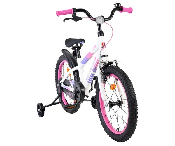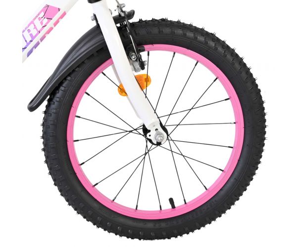 De Volare Lily 18 inch kinderfiets is een prachtige fiets voor jonge meiden die graag in stijl fietsen. Met haar frisse witte kleur, paarse en roze accenten en opvallende roze velgen en handvaten is deze fiets een echte eyecatcher.