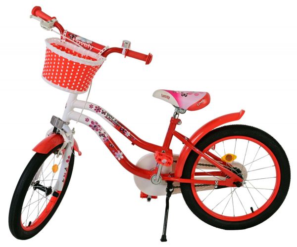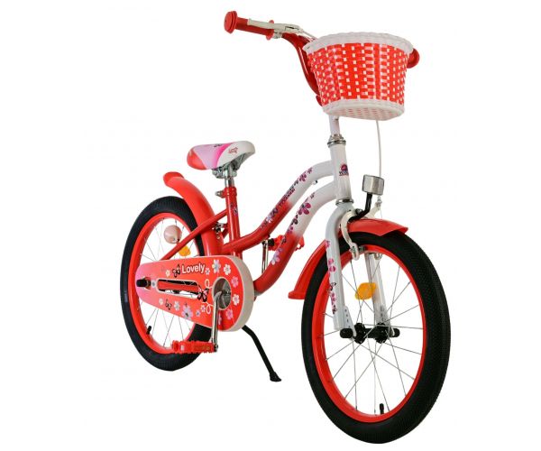 De Volare Lovely 18 inch kinderfiets is dé fiets waar ieder meisje van droomt. De vlinders en bloemen op het frame en zadel maken het design van de rode fiets helemaal af. Om vaart te kunnen minderen heeft de fiets zowel een handrem als een terugtraprem. Ter bescherming van de kleine vingertjes heeft de fiets een gesloten kettingkast. Met de fietsbel kun je laten weten dat je de hoek om komt. Om spulletjes mee te kunnen nemen heeft de fiets een prachtig kunststof mandje.