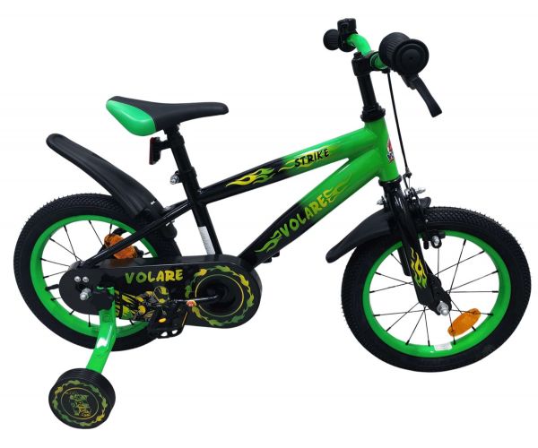 De Volare Strike 14 inch kinderfiets is een stoere fiets voor jonge racers die klaar zijn voor hun eerste grote avonturen op twee wielen. Met zijn sportieve zwart-groen design en robuuste uitstraling is deze fiets een echte blikvanger.
