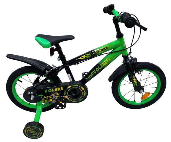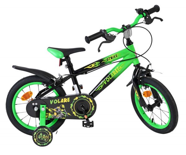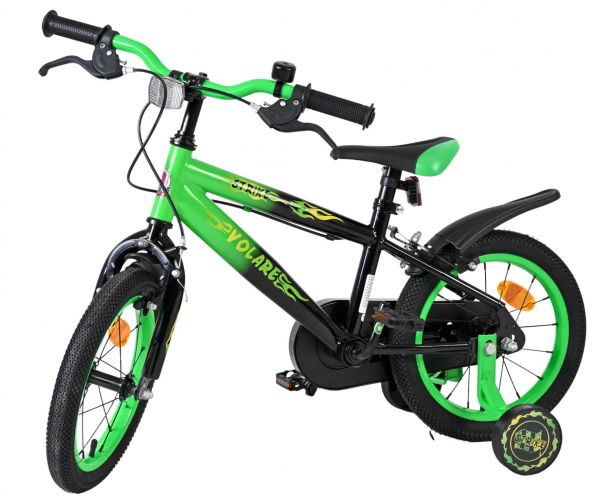 De Volare Strike 14 inch kinderfiets is een stoere fiets voor jonge racers die klaar zijn voor hun eerste grote avonturen op twee wielen. Met zijn sportieve zwart-groen design en robuuste uitstraling is deze fiets een echte blikvanger.