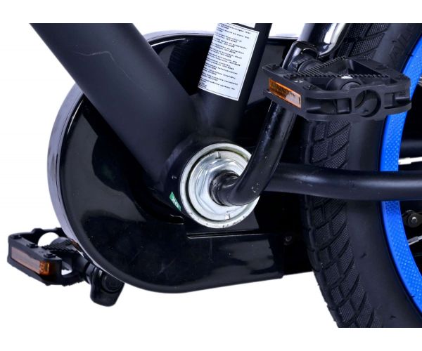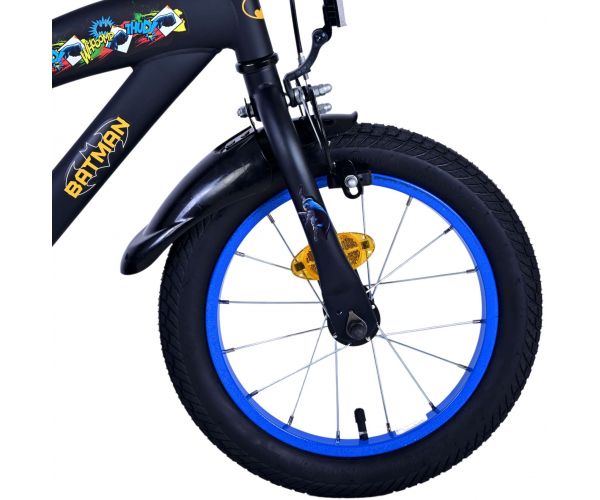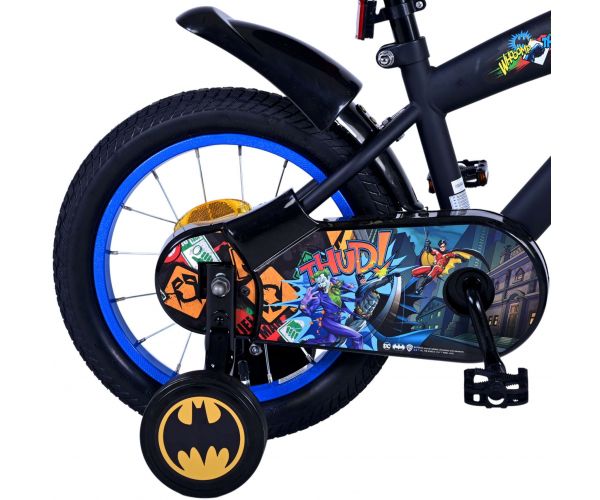 Sikkerhed kommer først! Derfor har denne seje cykel en håndbremse, en rullebremse og en lukket kædekasse. Derudover har cyklen aftagelige sidehjul til hurtig indlæring, ringeklokke og reflekser i pedalerne. Der er også tænkt på komforten. Den smukke sorte Batman-cykel med blå detaljer har ekstra lange skærme, der stopper alt snavset, en behagelig blød sadel og et unikt stel, der kan holde til lidt af hvert. For at du kan nyde cyklen så længe som muligt, kan sadlen og styret justeres i højden. Kort sagt: en cykel i topkvalitet, som dit barn vil nyde i mange år fremover!