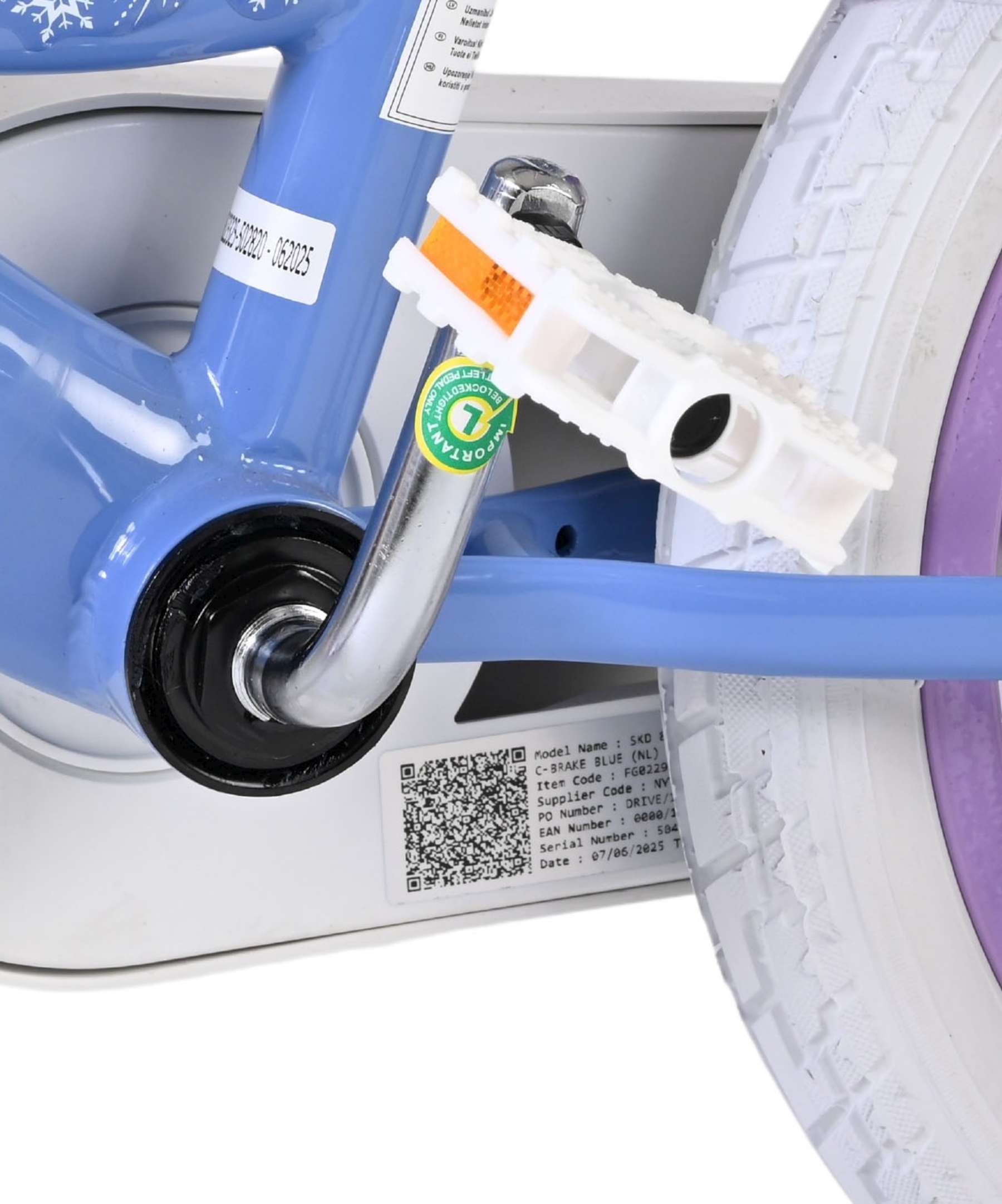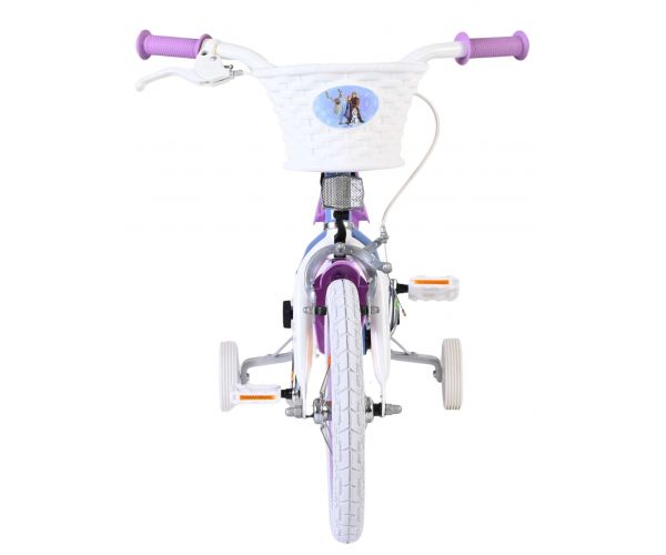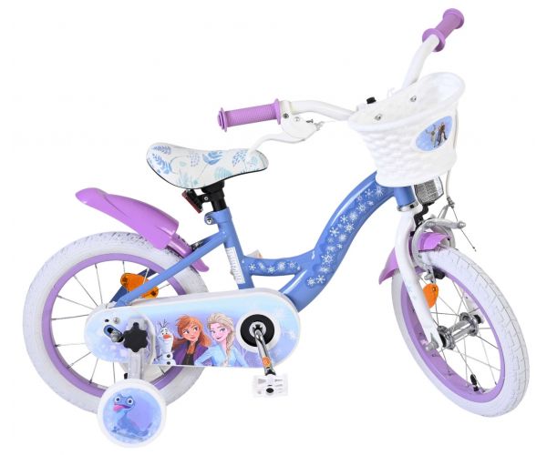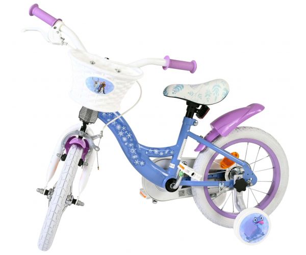 Sikkerhed først! Derfor har denne seje cykel en håndbremse og en baghjulsbremse og aftagelige støttehjul. Vi har også tænkt på komfort. Den smukke blå Frozen-cykel er udstyret med en kurv. For at du kan nyde cyklen så længe som muligt, kan sadlen og styret justeres i højden.