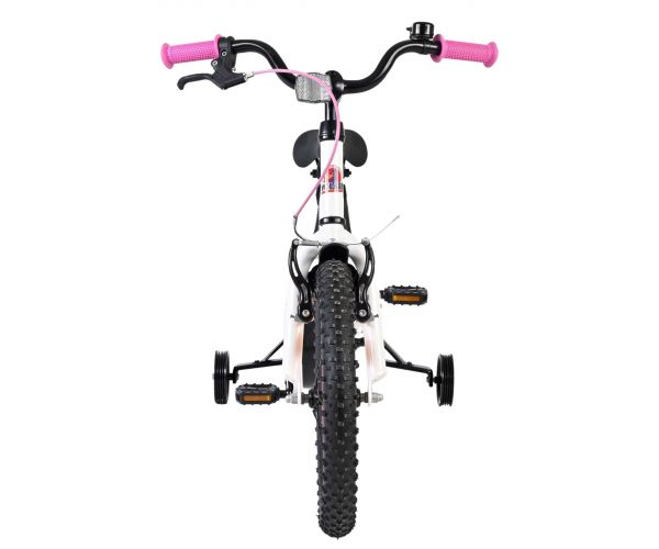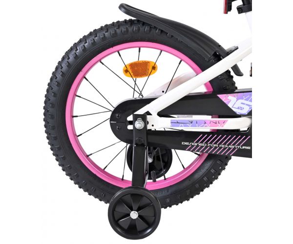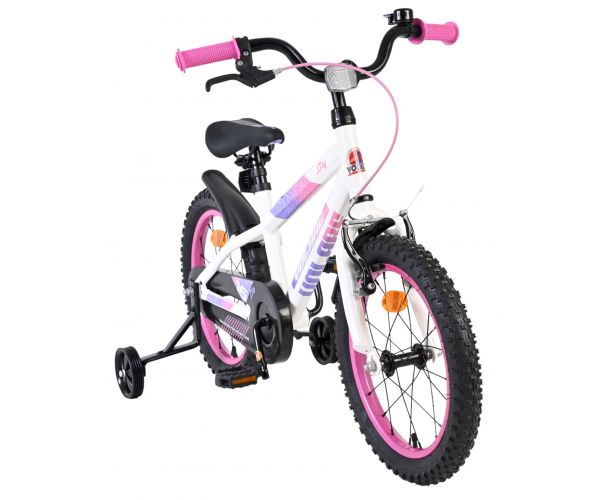 De Volare Lily 16 inch kinderfiets is een prachtige fiets voor jonge meiden die graag in stijl fietsen. Met haar frisse witte kleur, paarse en roze accenten en opvallende roze velgen en handvaten is deze fiets een echte eyecatcher.