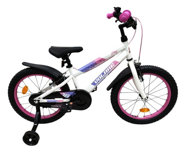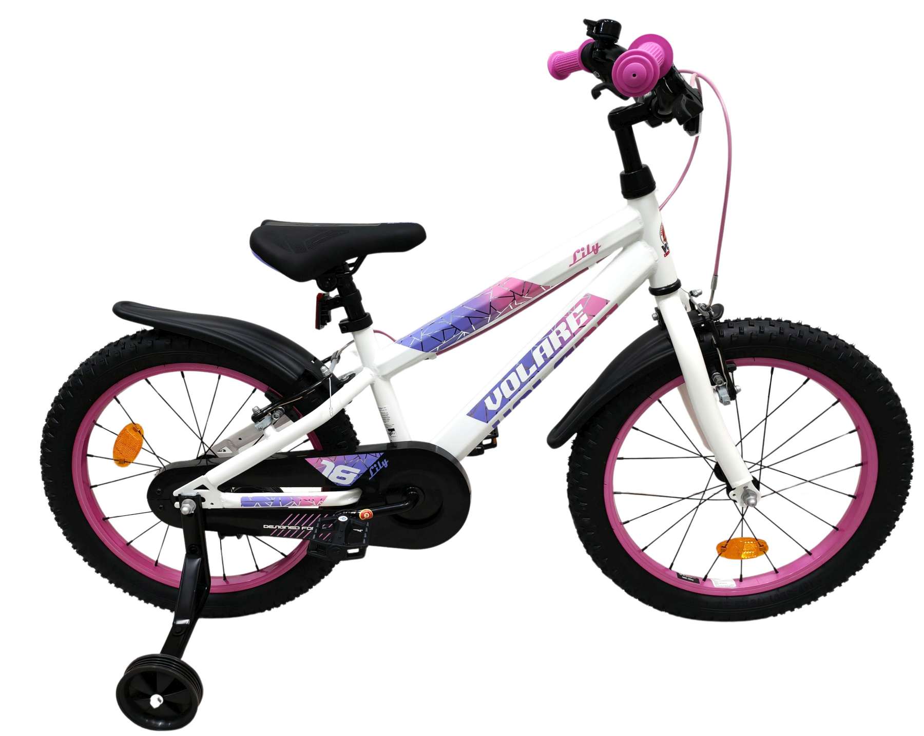 De Volare Lily 18 inch kinderfiets is een prachtige fiets voor jonge meiden die graag in stijl fietsen. Met haar frisse witte kleur, paarse en roze accenten en opvallende roze velgen en handvaten is deze fiets een echte eyecatcher.