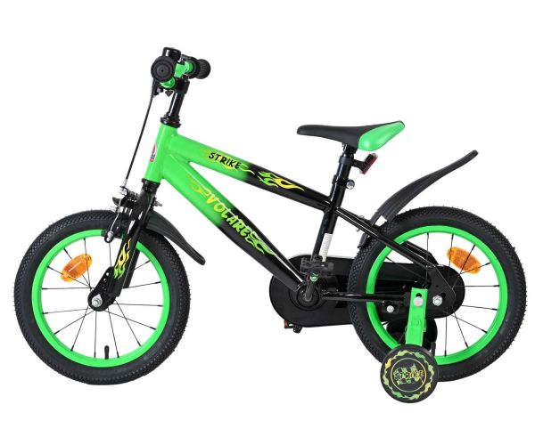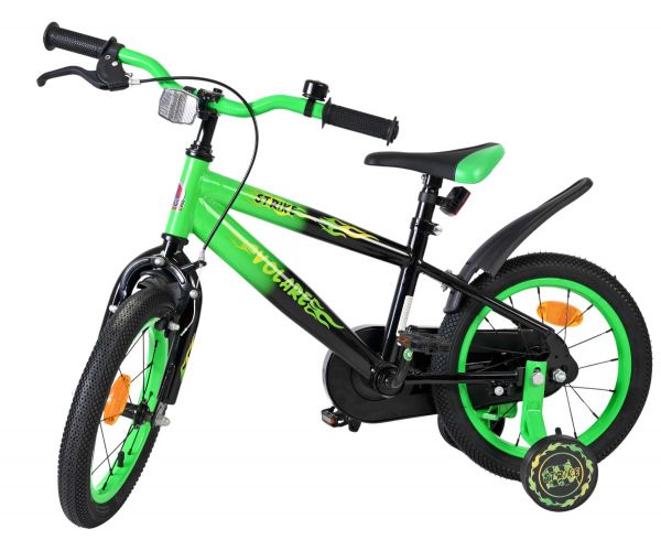 De Volare Strike 14 inch kinderfiets is een stoere fiets voor jonge racers die klaar zijn voor hun eerste grote avonturen op twee wielen. Met zijn sportieve zwart-groen design en robuuste uitstraling is deze fiets een echte blikvanger.