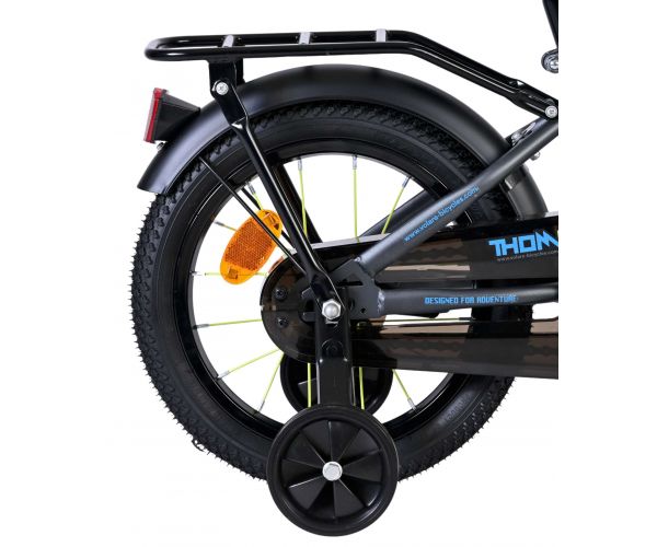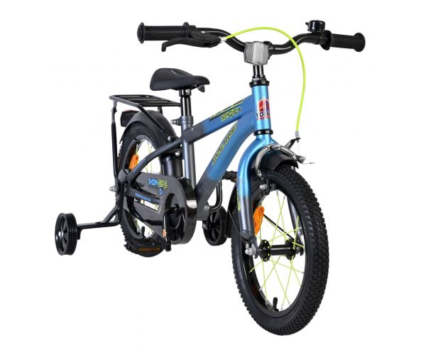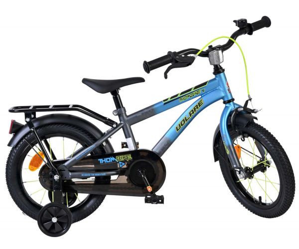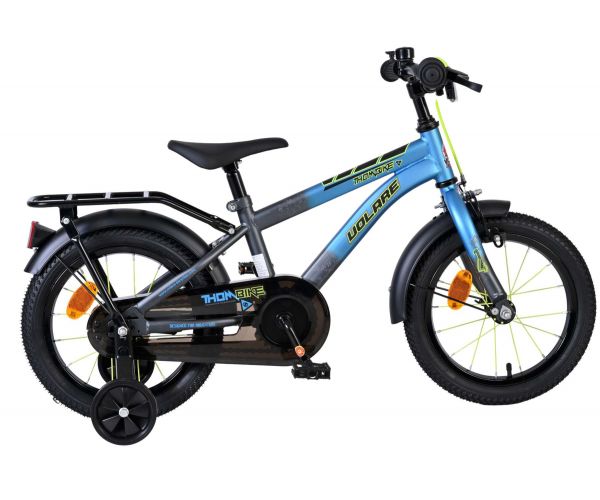 De Volare Thombike 14 inch in blauw met grijze accenten is een stoere kinderfiets met een sportieve uitstraling, perfect om veilig en met vertrouwen te leren fietsen. Dankzij de stevige afwerking en het frisse design is dit een echte favoriet voor jonge rijders.