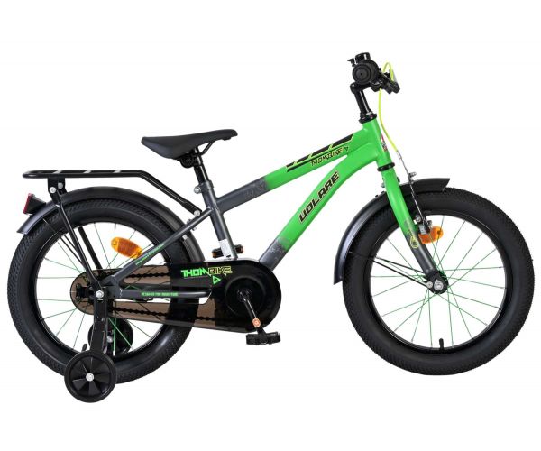 De Volare Thombike 16 inch kinderfiets in Groen met grijze details is perfect voor jonge fietsers die houden van een stoere en moderne uitstraling. Deze degelijke kinderfiets is voorzien van een dichte kettingkast, waardoor de bewegende onderdelen veilig zijn afgeschermd en de fiets minder onderhoud vraagt. Met de afneembare zijwielen kan ieder kind stap voor stap leren fietsen en later moeiteloos overstappen naar zelfstandig fietsen.