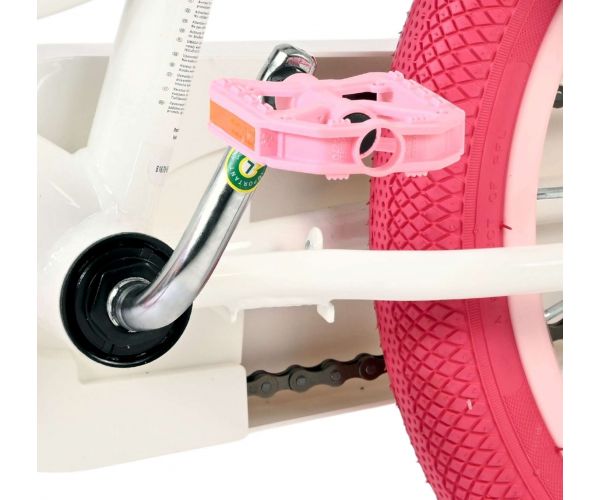 Met de afneembare zijwielen leren kinderen stap voor stap zelfstandig fietsen. De roze banden geven de fiets een vrolijke en stijlvolle look. Voorop zit een handig mandje en achterop een poppenzitje, ideaal om favoriete speelgoed mee te nemen. Bovendien is de fiets voorzien van reflectoren voor, achter en in de wielen, zodat je kind goed zichtbaar is. De bel maakt het geheel helemaal af.