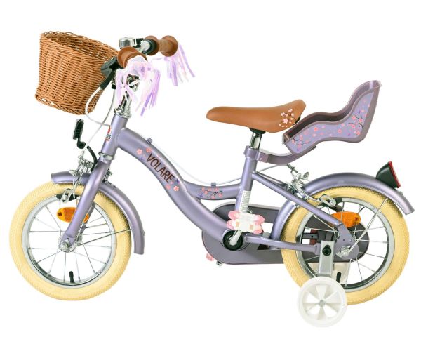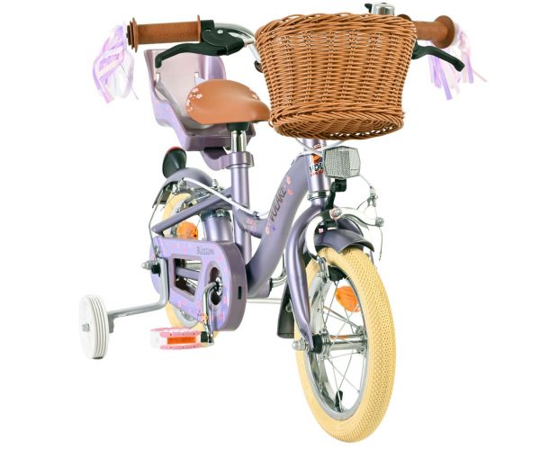 Safety comes first! Therefore, this cool bike has no coaster brake but two hand brakes and removable training wheels. Comfort is also thought of. The beautiful purple Blossom bike has a comfortable saddle, a doll's seat, a wicker basket and cheerful handle streamers to brighten up the bike. To enjoy the bike as long as possible, the saddle and handlebars are adjustable in height.