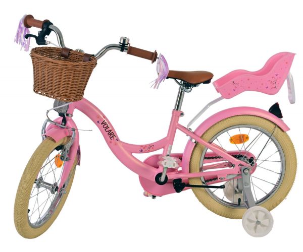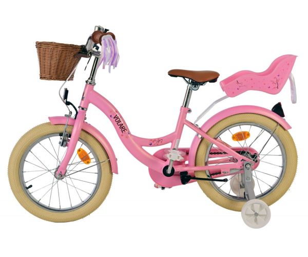 Safety comes first! Therefore, this cool bike has a handbrake and a coaster brake, removable training wheels and a closed chaincase. Comfort is also thought of. The beautiful pink Volare bike has a comfortable soft saddle, a doll's seat, cheerful handle decorations and a handy wicker basket. To enjoy the bike as long as possible, the saddle and handlebars are adjustable in height. Comes complete with all the assembly materials needed to assemble the bike!