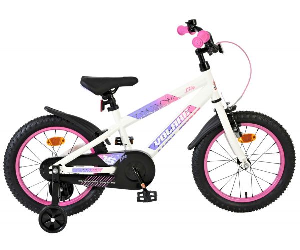 De Volare Lily 16 inch kinderfiets is een prachtige fiets voor jonge meiden die graag in stijl fietsen. Met haar frisse witte kleur, paarse en roze accenten en opvallende roze velgen en handvaten is deze fiets een echte eyecatcher.