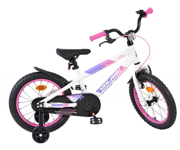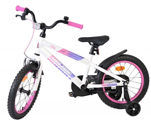 De Volare Lily 16 inch kinderfiets is een prachtige fiets voor jonge meiden die graag in stijl fietsen. Met haar frisse witte kleur, paarse en roze accenten en opvallende roze velgen en handvaten is deze fiets een echte eyecatcher.