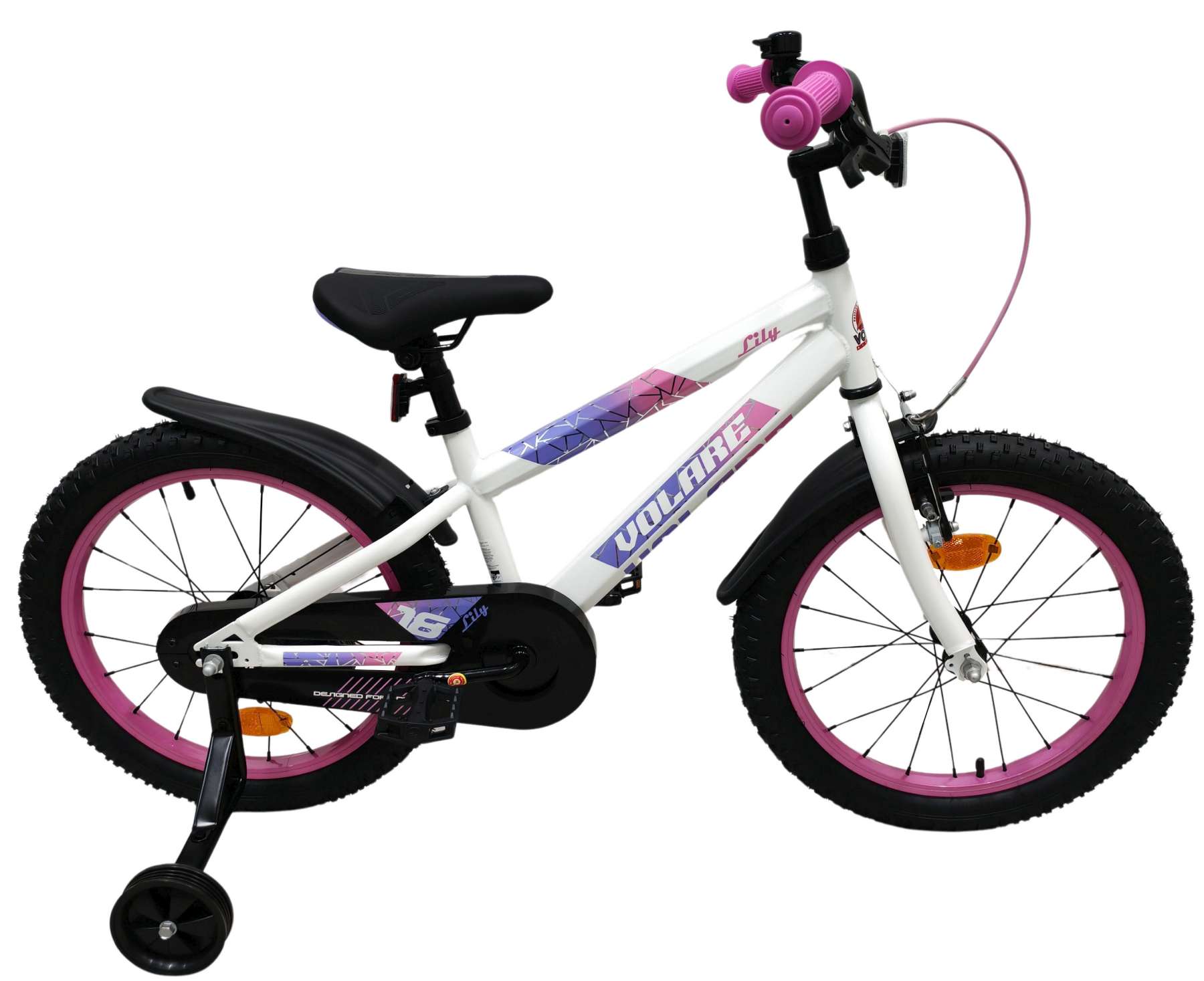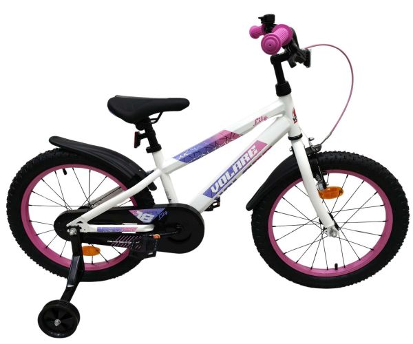 De Volare Lily 18 inch kinderfiets is een prachtige fiets voor jonge meiden die graag in stijl fietsen. Met haar frisse witte kleur, paarse en roze accenten en opvallende roze velgen en handvaten is deze fiets een echte eyecatcher.