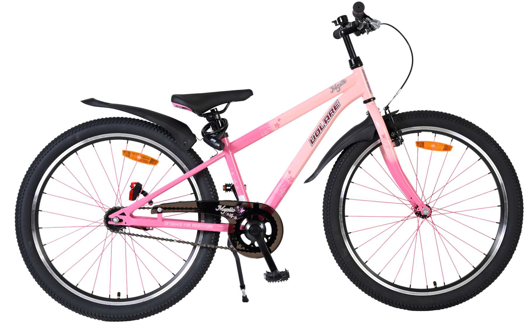 De fiets heeft verlichting aan de voor- en achterkant en reflectoren in de wielen, waardoor je kind goed zichtbaar is in het verkeer. Het sportieve karakter wordt extra benadrukt door de opvallende roze spaken, die de fiets een unieke uitstraling geven. Daarnaast beschikt de Volare Mystic over een slot en een bel, zodat je kind veilig en goed voorbereid op pad kan.