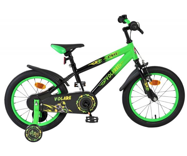 De Volare Strike 16 inch kinderfiets is de ideale fiets voor jonge avonturiers die graag in stijl op pad gaan. Met zijn stoere zwart-groene design en sportieve uitstraling is deze fiets een echte blikvanger voor elke kleine fietser.