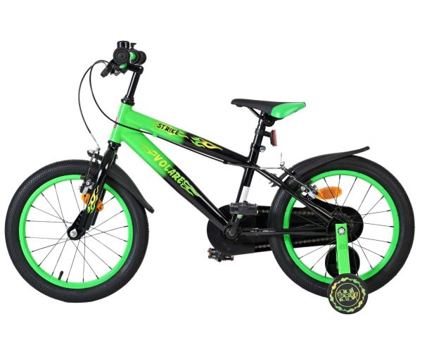 De Volare Strike 16 inch kinderfiets is de ideale fiets voor jonge avonturiers die graag in stijl op pad gaan. Met zijn stoere zwart-groene design en sportieve uitstraling is deze fiets een echte blikvanger voor elke kleine fietser.