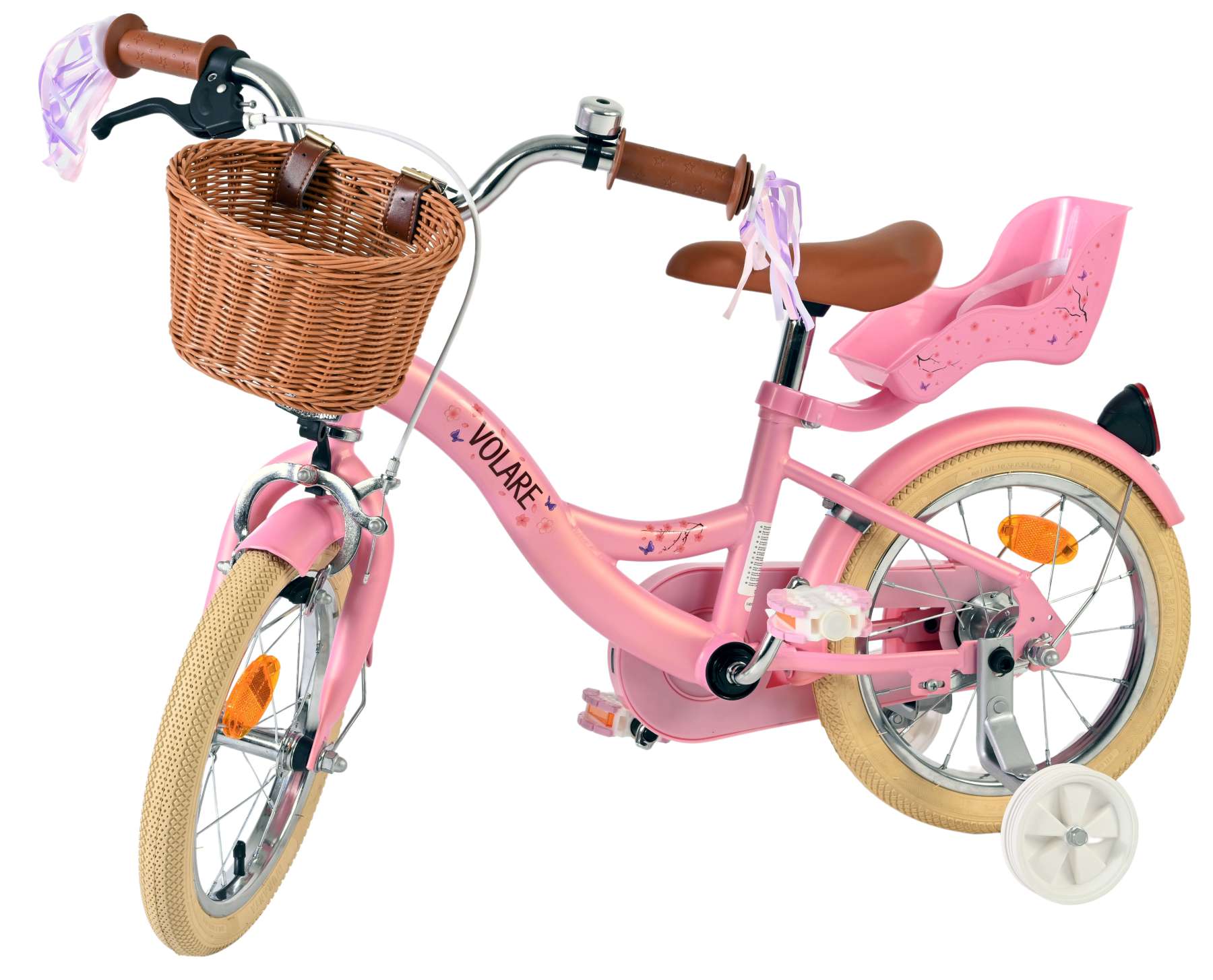Veiligheid staat voorop! Daarom heeft deze gave fiets een handrem en terugtraprem, afneembare zijwieltjes en een gesloten kettingkast. De fiets heeft reflectoren van voor, achter en in de wielen. Ook aan het comfort is gedacht. De mooie roze Volare fiets heeft een poppenzitje, een comfortabel zacht zadel en een handig rieten mandje. Om zo lang mogelijk van de fiets te kunnen genieten zijn het zadel en stuur in hoogte verstelbaar. Wordt geleverd inclusief al het montagemateriaal dat nodig is om de fiets in elkaar te zetten!