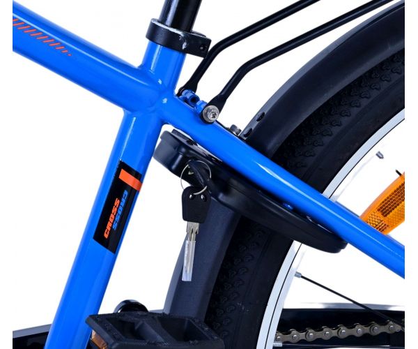 De Volare Cross 24 inch kinderfiets in donkerblauw is een veilige én stoere keuze met 3 versnellingen, terugtraprem en batterijverlichting. Met achterdrager, comfortabel zadel en stevig slot is deze fiets ideaal voor elke schooldag en avontuur!