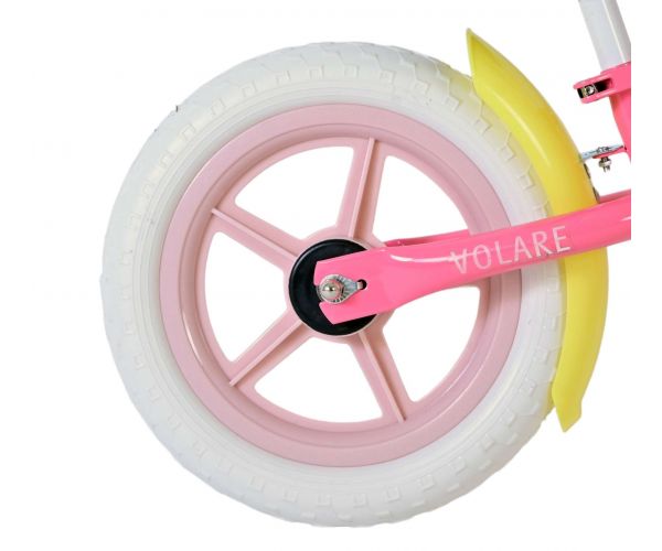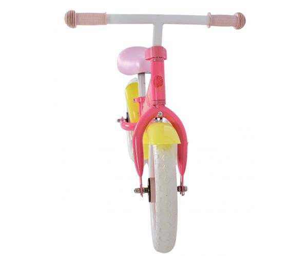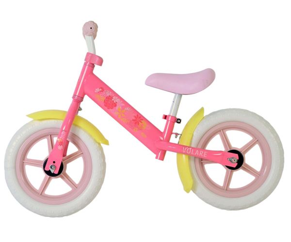 Deze lieve roze loopfiets is perfect voor kinderen van 1 tot 3 jaar die hun eerste stapjes in de fietswereld zetten. Met vrolijke gele spatborden en pastelroze velgen is deze fiets een echte eyecatcher voor elk avontuur in de straat of tuin.