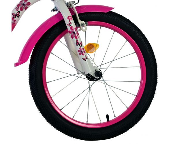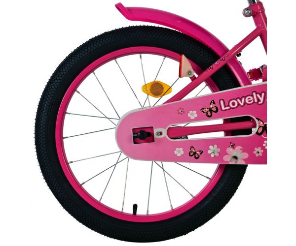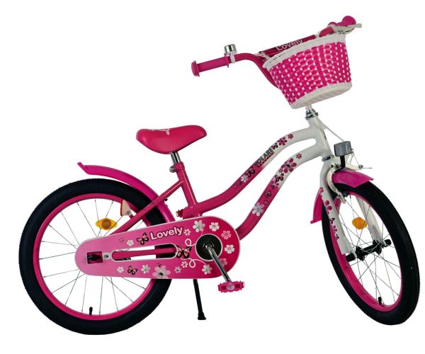 De Volare Lovely 18 inch kinderfiets is dé fiets waar ieder meisje van droomt. De vlinders en bloemen op het frame en zadel maken het design van de roze fiets helemaal af. Om vaart te kunnen minderen heeft de fiets zowel een handrem als een terugtraprem. Ter bescherming van de kleine vingertjes heeft de fiets een gesloten kettingkast. Met de fietsbel kun je laten weten dat je de hoek om komt. Om spulletjes mee te kunnen nemen heeft de fiets een prachtig kunststof mandje. Met de afneembare zijwieltjes kan ieder kind snel leren fietsen.
