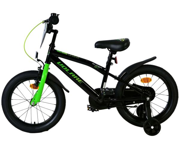 Veiligheid staat voorop! Daarom heeft deze gave fiets een handrem en terugtraprem, een gesloten kettingkast en afneembare zijwieltjes. Daarnaast heeft de fiets reflectoren in de wielen, voor- en achterop de fiets en een leuke bel. Ook aan het comfort is gedacht. De mooie zwarte Volare fiets met groene accenten heeft een zacht zadel, een tijdloos design, en een uniek frame dat wel tegen een stootje kan. Om zo lang mogelijk van de fiets te kunnen genieten zijn het zadel en stuur in hoogte verstelbaar. Wordt geleverd inclusief al het montagemateriaal dat nodig is om de fiets in elkaar te zetten!
