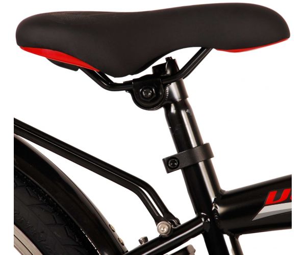 Veiligheid staat voorop! Daarom heeft deze gave fiets een handrem en terugtraprem en verlichting op batterij voor en achter. Daarnaast heeft de fiets een leuke bel en reflectoren in de wielen. Ook aan het comfort is gedacht. De mooie zwarte Volare fiets met rode accenten heeft een luxe zacht zadel en extra zachte handvaten, een handige achterdrager, en een stevig frame dat wel tegen een stootje kan. Verder heeft de fiets een standaard zodat hij netjes blijft staan en een sterk slot. Om zo lang mogelijk van de fiets te kunnen genieten heeft deze een extra lange zadelpen waardoor de fiets nóg langer met het kind meegroeit en ook het stuur is in hoogte verstelbaar.