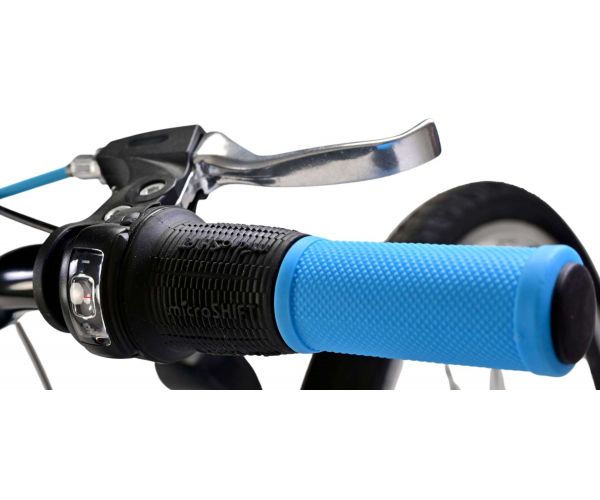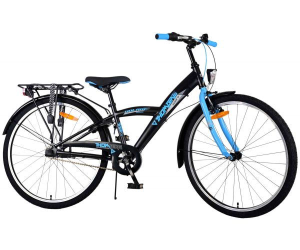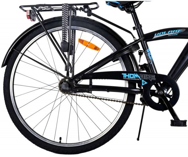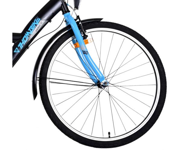 De zwarte Volare Thombike 26 inch kinderfiets met blauwe accenten is stoer, veilig én comfortabel met 3 Shimano versnellingen, terugtraprem en batterijverlichting. Dankzij verstelbaar stuur en zadel, stevige achterdrager en robuust frame groeit deze fiets moeiteloos met je kind mee!